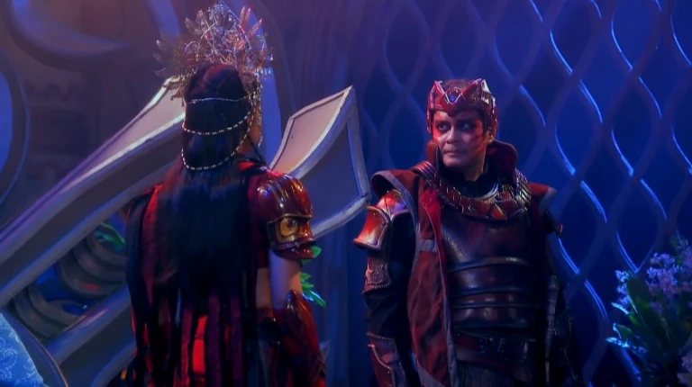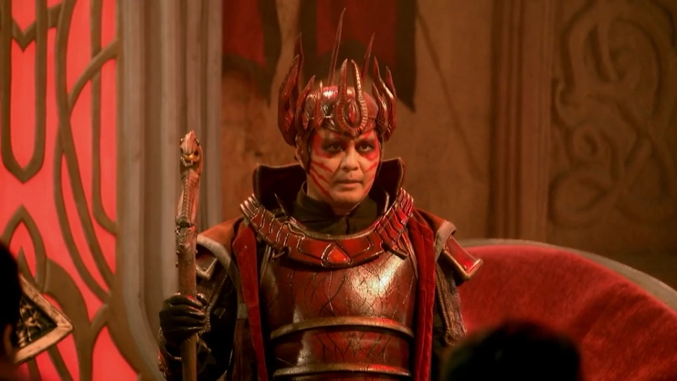 Hagorn's outfit in Balaak is defined by a fierce, dark, featuring a jagged, spiked crown, dark robes or cloaks, and menacing red stripes of makeup across his face, all saturated in red light to emphasize his evil, tyrannical nature as the former king of Hathoria. The question about the Devas symbols in the headgear relates to the larger lore: the Devas Circle of Spirituality is associated with the Gem of Air and faith (Emre), with the Devas Circle of Emotion is linked to the Gem of Fire and passion (Arde). While both are simply philosophical principles, the Circle of Emotion is most closely associated with the "dark" side, as its related god, Arde, is known to manipulate emotions and drive Encantados toward negative or evil actions.
