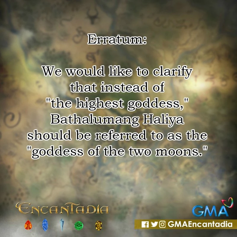 - Encantadia 2016's Social Media Accounts have accidentally posted a poster with the caption saying that Haliya is the Highest Bathaluman, however this was taken down and they posted a clarification of the accidental post. This also clarifies that Emre calling Haliya as the Highest Bathaluman is a wrong reference.[1]