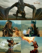 A dragon suddenly appears and attacks the Sang’gres. The sisters quickly arm themselves and engage the creature in battle. Pirena defends against the dragon’s fire breath, Amihan counters its tail strikes, Danaya retaliates using her geokinesis, and Alena attacks with water-based magic. Ultimately, the sisters combine the powers of the elemental gems to defeat the dragon, killing it in the process.